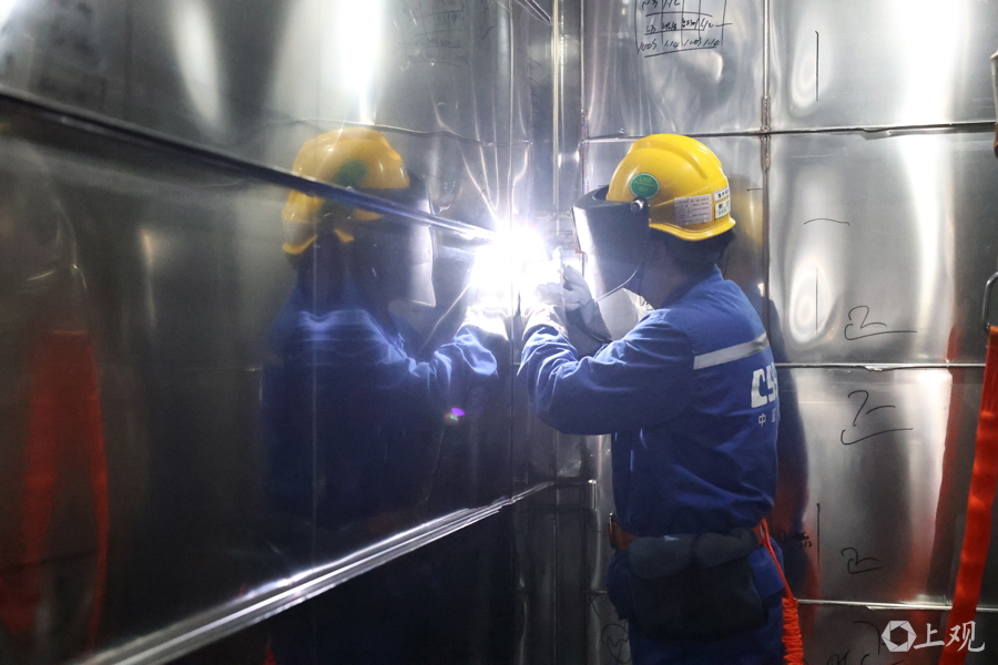LNG船液货舱内部相当于十层楼高,工人们需要通过脚手架密集分区作业完成焊接。