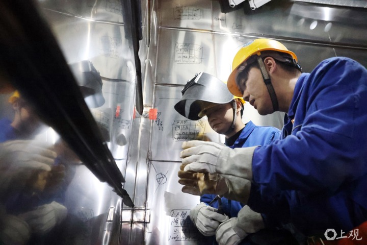 沪东中华技能带头人、大国工匠张冬伟在进行殷瓦钢焊接。