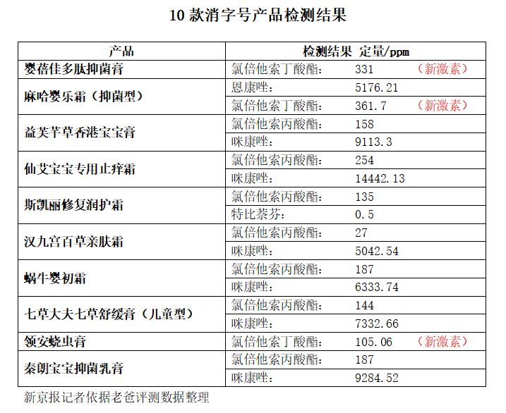 其表示,除了上述两款产品外,老爸评测还随机公证购买了8款消字号产品,其中6款为消字号儿童面霜,2款消字号抑菌膏,经第三方实验室检测,8款产品全部检测出激素,其中领安蛲虫膏也检测出了新激素氯倍他索丁酸酯。其余7款均检测出了氯倍他索丙酸酯,仙艾宝宝专用止痒霜的含量最高,高达近254ppm。此外,8款产品中,有6款检测出了抗真菌药物咪康唑,依然是仙艾宝宝专用止痒霜,含量高达14442.13ppm。而商家为了卖货,宣传产品“无激素”“零添加”“草本萃取”“可以天天用”,甚至有商品的详情页放有激素未检出报告。