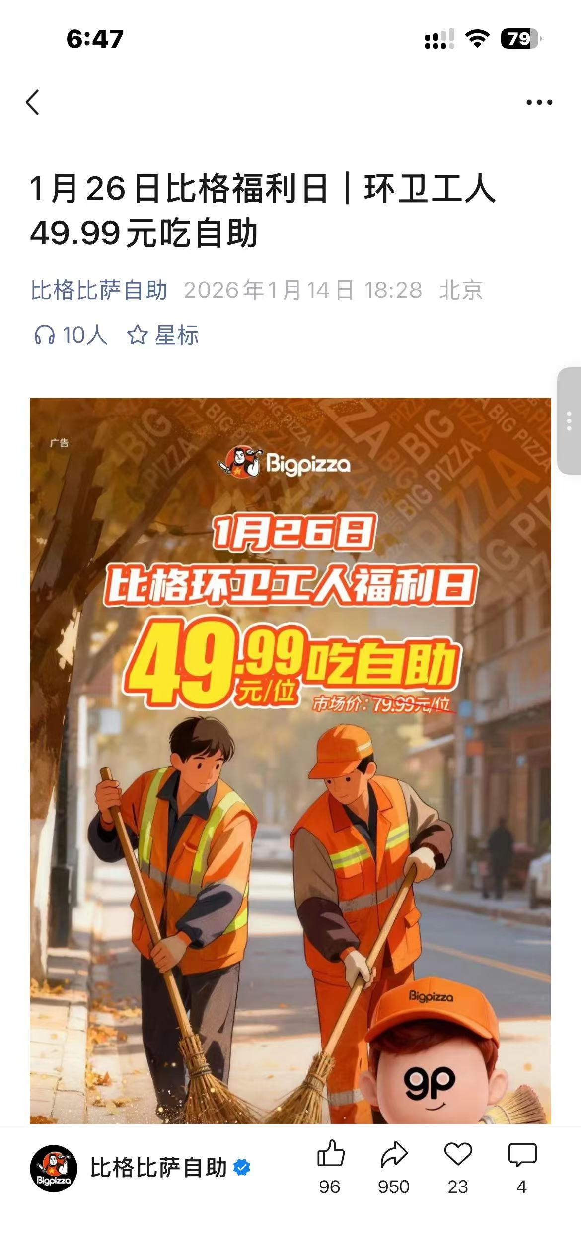 1月14日晚间,连锁餐饮品牌比格比萨推出“环卫工人福利日”活动。据其发布的相关宣传海报,活动定为1月26日国际清洁能源日当天,环卫工人凭工作证或身着工作服到店,可享49.99元/位的自助优惠,市场价为79.99元/位。