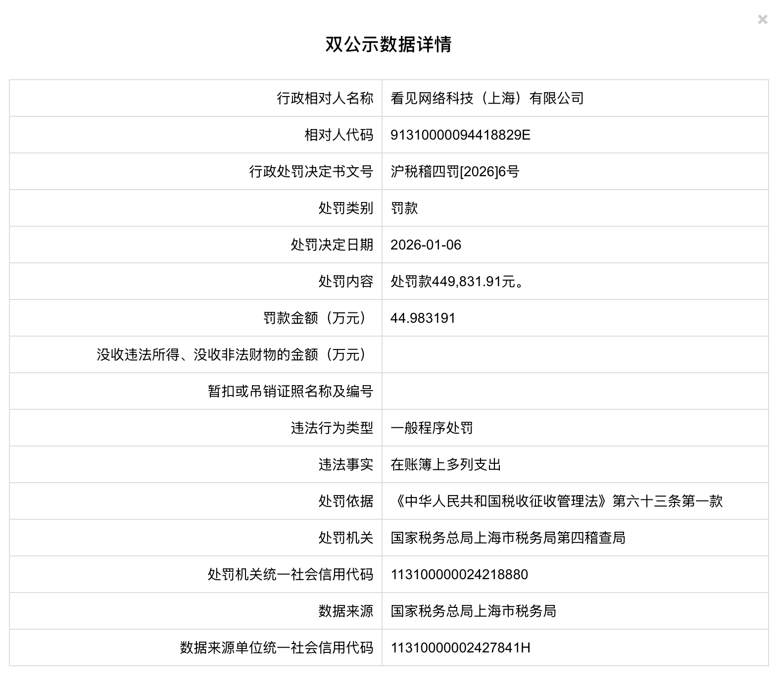 近日,国家税务总局上海市税务局第四稽查局依法对看见网络科技(上海)有限公司的税务违法行为作出了行政处罚决定。
