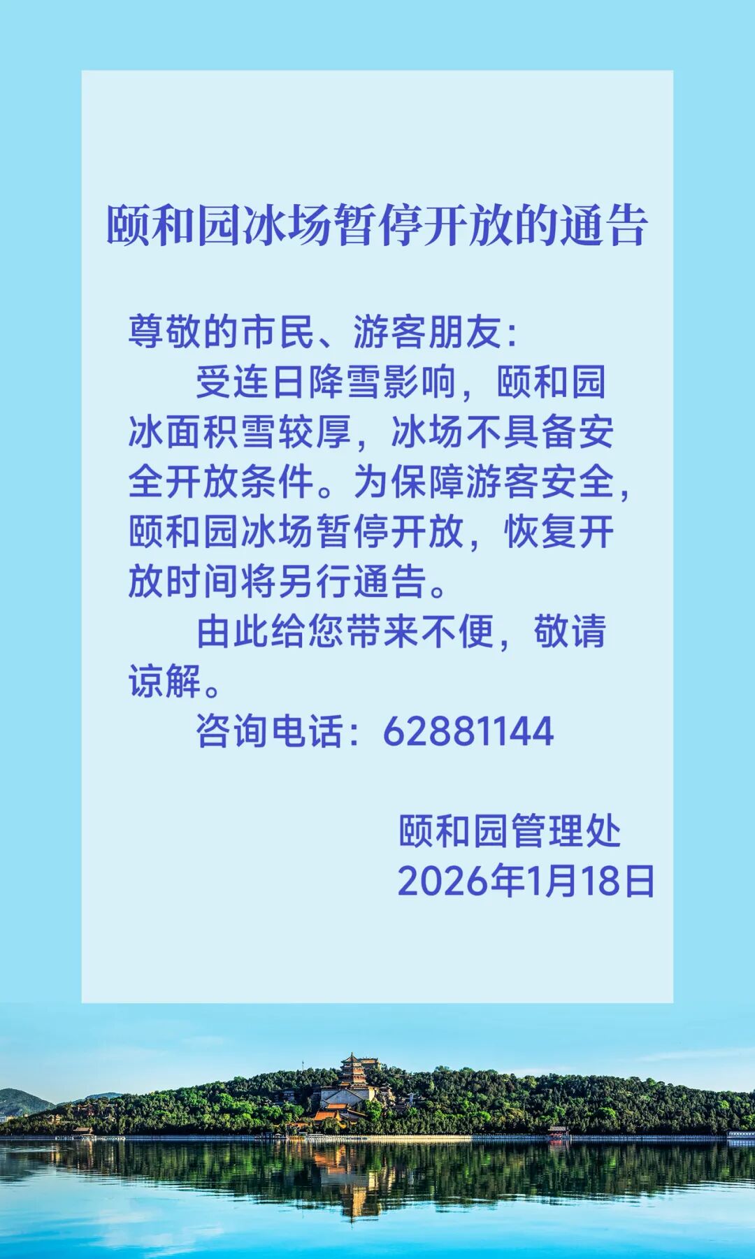 1月18日,颐和园发布冰场暂停开放的通告:受连日降雪影响,颐和园冰面积雪较厚,冰场不具备安全开放条件。为保障游客安全,颐和园冰场暂停开放,恢复开放时间将另行通告。