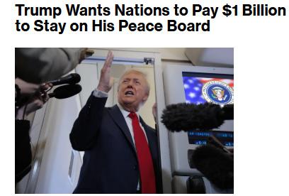 中新网1月18日电据彭博社当地时间17日报道,美国总统特朗普开出10亿美元捐款的价码,供有意愿参与所谓“和平委员会”的国家获得永久席位,不受三年任期限制。