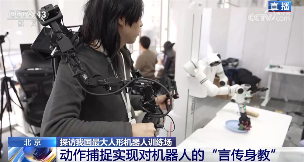 那您可能要问了,老师教学生讲究一个“言传身教”,那么,训练师和机器人之间是怎么交流的呢?您看,这位戴着VR眼镜、拿着操作手柄的训练师就正在给这台机器人上课。还有您看,当训练师按操作键时,机器人的手臂可以移动、手指也会进行抓取。还有的训练师会穿上布满传感器的动作捕捉衣,让机器人可以在更精准的数据指导下进行训练。机器人就是在这些数据的传输中,一遍一遍模仿,反复练习,从而提高每个动作的精准度。