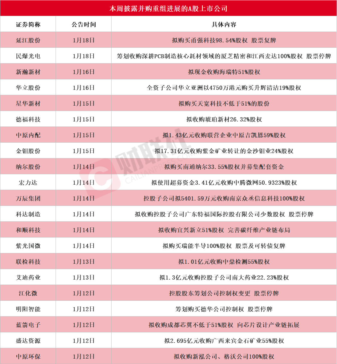 据财联社不完全统计,截至发稿,本周(1月12日-1月18日)包括延江股份、民爆光电、新瀚新材、华立股份、星华新材、德福科技、中原内配、金钼股份、纳尔股份、宏力达、万辰集团、科达制造、和顺科技、紫光国微、联检科技、艾迪药业、江化微、明阳智能、蓝箭电子、盛达资源、中原环保在内的21家A股上市公司披露并购重组进展最新公告。其中,延江股份公告称,拟通过发行股份及支付现金的方式购买甬强科技98.54%的股权,同时向厦门延盛、谢继华发行股份募集配套资金,股票复牌。