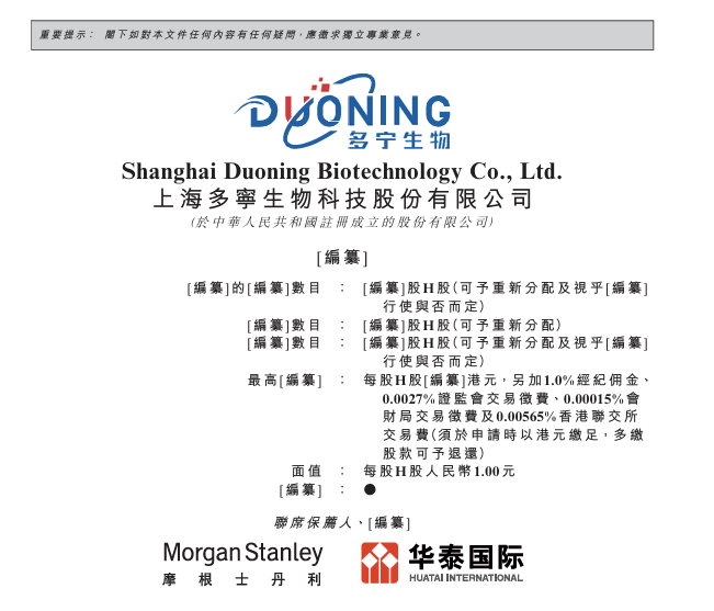 【大河财立方消息】1月18日,上海多宁生物科技股份有限公司(以下简称:多宁生物)向港交所提交上市申请书,联席保荐人为摩根士丹利、华泰国际。