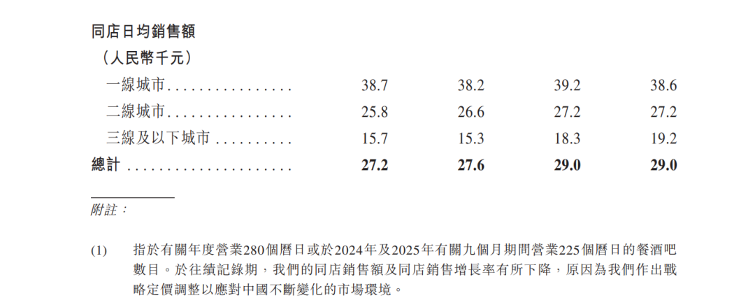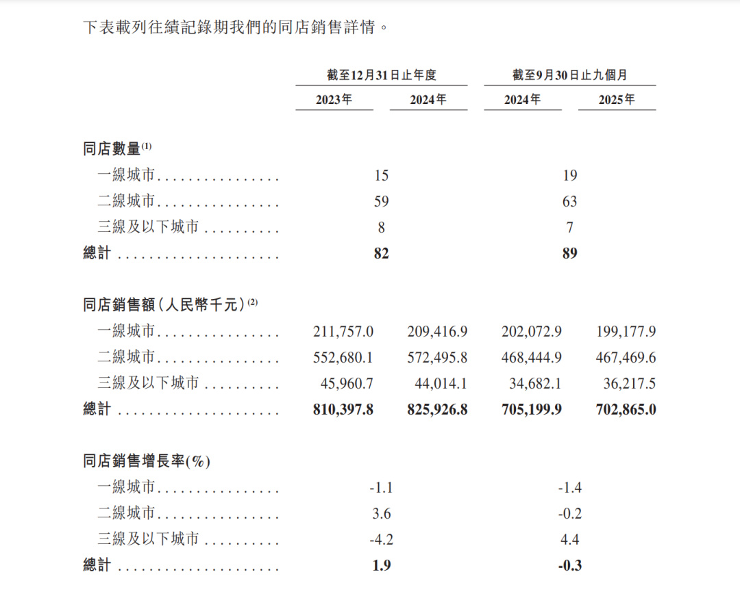 分城市线级来看,一线城市成为拖累同店销售的主要因素,2024年一线城市同店销售增长率为-1.1%,2025年前三季度降幅扩大至-1.4%,连续两个报告期录得负增长。与此同时,二线城市同店销售增长率也由正转负,2025年前三季度为-0.2%,仅三线及以下城市保持4.4%的正增长。