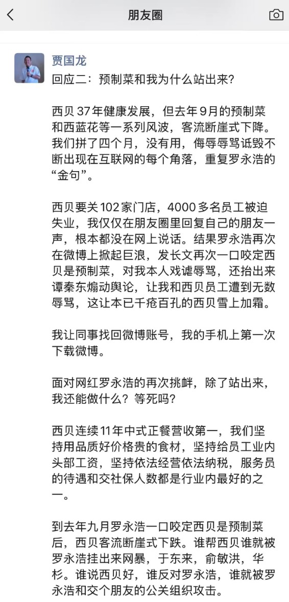 在回应中,贾国龙称:“西贝要关102家门店,4000多名员工被迫失业,我仅仅在朋友圈里回复自己的朋友一声,根本都没在网上说话。结果罗永浩再次在微博上掀起巨浪,发长文再次一口咬定西贝是预制菜,让我和西贝员工遭到无数辱骂,让本已千疮百孔的西贝雪上加霜。”