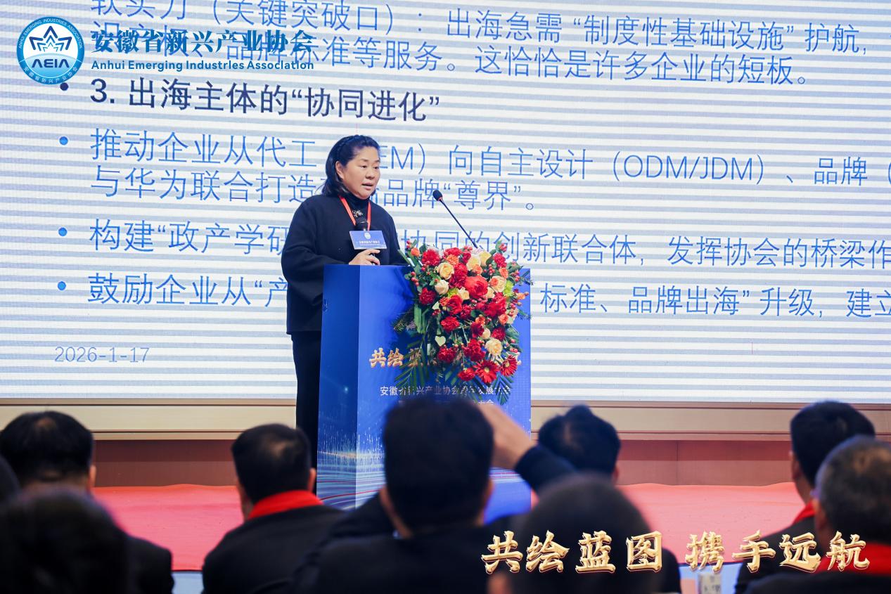 在主题分享环节,安徽大学经济学院教授陈素川以《向新而行,出海致远——安徽新兴产业在"十五五"的升级与跨越》为题,系统分析了"十五五"期间安徽省新兴产业面临的宏观环境、政策机遇与挑战。她认为,安徽应进一步强化科技创新策源功能,推动战略性新兴产业融合集群发展,并通过高水平"走出去"参与全球价值链重塑,实现从"跟跑"到"并跑"乃至"领跑"的转变。