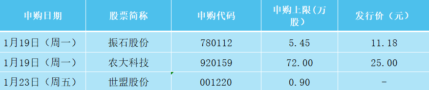 本周A股有3只新股发行,分为振石股份(上交所主板)、农大科技(北交所)和世盟股份(深交所主板)。