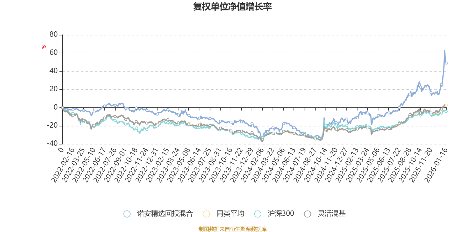 截至1月16日,诺安精选回报混合近三个月复权单位净值增长率为22.15%,位于同类可比基金83/1286;近半年复权单位净值增长率为54.36%,位于同类可比基金140/1286;近一年复权单位净值增长率为72.28%,位于同类可比基金127/1286;近三年复权单位净值增长率为56.76%,位于同类可比基金145/1286。