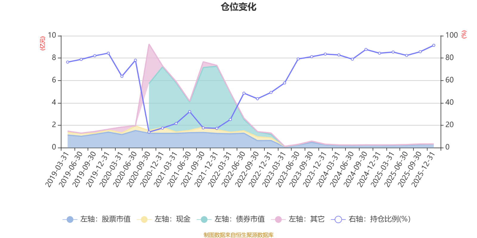 据定期报告数据统计,近三年平均股票仓位为81.74%,同类平均为72.46%。2025年末基金达到91.42%的最高仓位,2020年三季度末最低,为13.98%。