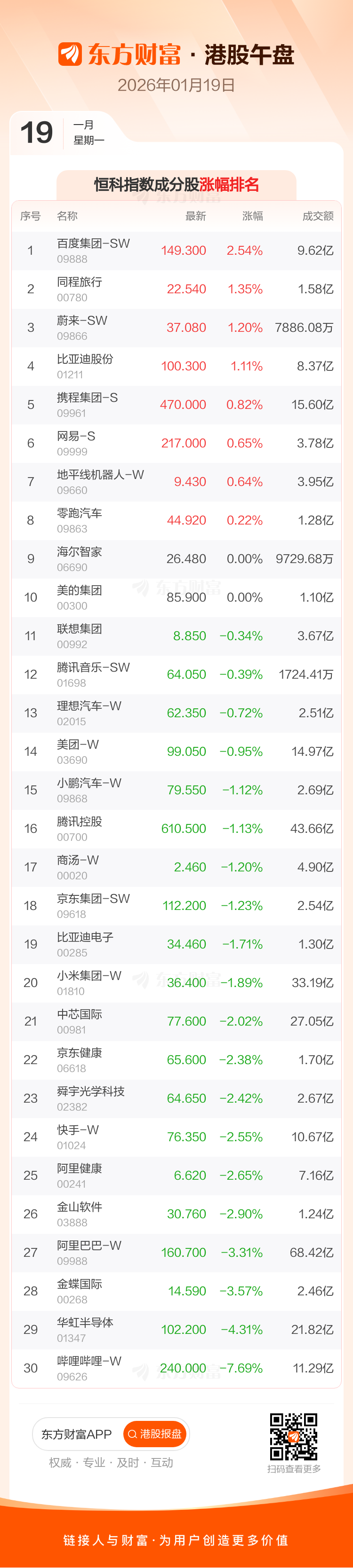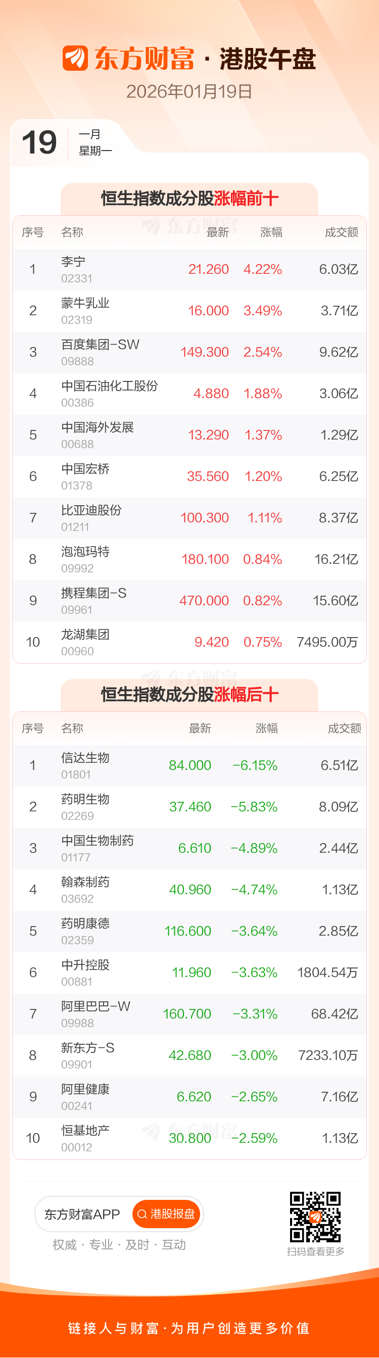港股1月19日午盘走低,恒生指数收报26579.0点,跌265.96点,跌幅0.99%;恒生科技指数收报5755.35点,跌66.83点,跌幅1.15%。恒生指数成分股中李宁、蒙牛乳业、百度集团-SW涨幅居前,信达生物、药明生物、中国生物制药跌幅靠前。恒生科技指数成分股中百度集团-SW、同程旅行、蔚来-SW涨幅居前,哔哩哔哩-W、华虹半导体、金蝶国际跌幅靠前。