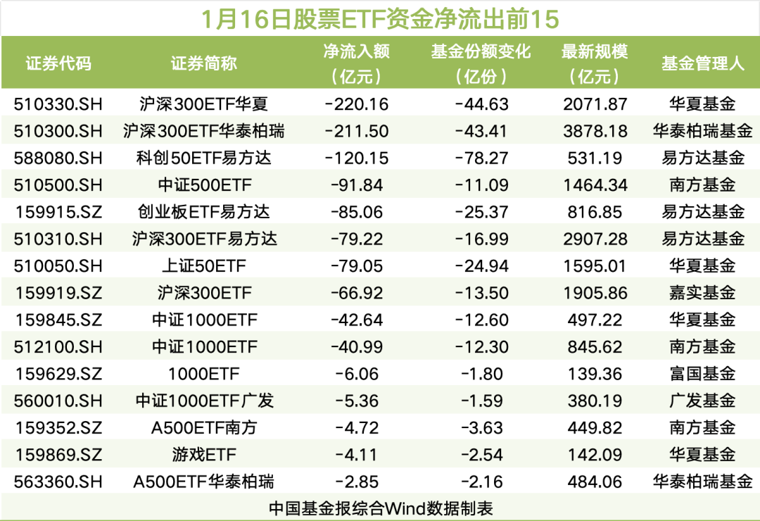 1月16日,A股市场高开低走,三大指数集体收跌。股票ETF市场上,资金延续净流出态势,当日净流出金额超855亿元。