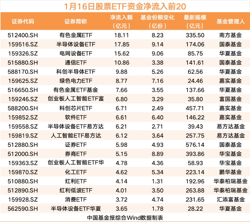 具体来看,1月16日共有57只ETF资金净流入超1亿元。其中,有色金属ETF、半导体设备ETF、电网设备ETF依次位列前三,资金净流入分别为18.11亿元、17.85亿元和15.62亿元。
