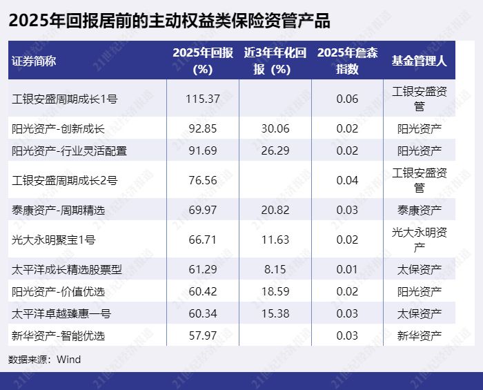 2025年收益率最高的权益类保险资管产品“工银安盛周期成长1号”实现翻倍收益,2025年收益率达115.37%。“阳光资产-创新成长”以92.85%的收益率排第二,“阳光资产-行业灵活配置”以91.69%排第三。