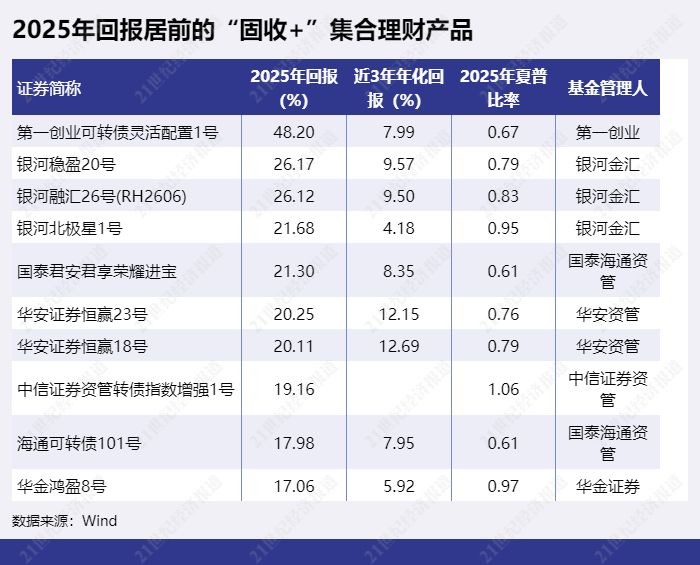 “固收+”券商集合理财产品中,2025年收益率排第一的是“第一创业可转债灵活配置1号”,2025年收益率为48.2%。该产品2025年三季报显示,该产品2025年三季度末持仓以国债和可转债为主。
