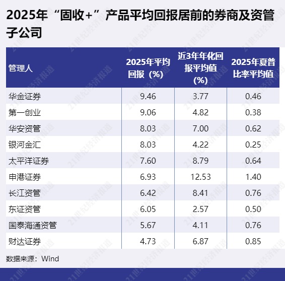 2025年“固收+”产品平均回报排名靠前的券商及资管子公司包括华金证券、第一创业、华安资管等,平均回报排名靠后的券商及资管子公司则包括中航证券、国金资管、国证资管等。