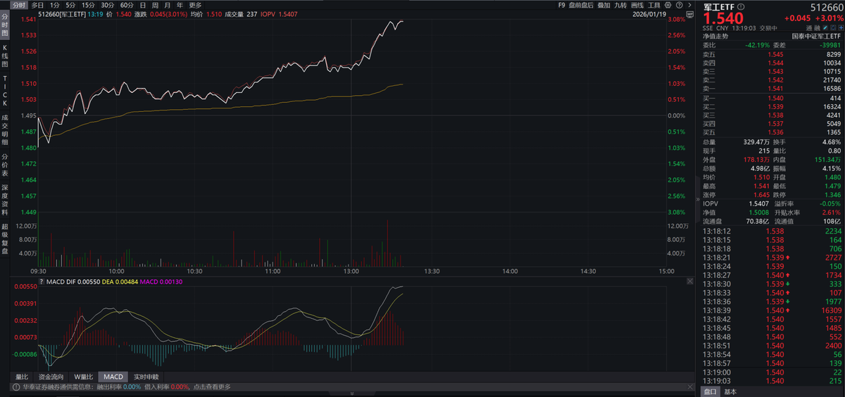 军工行业基本面再受提振,军工ETF(512660)大涨超3%,全面覆盖海陆空天信全产业链,规模超105亿元。