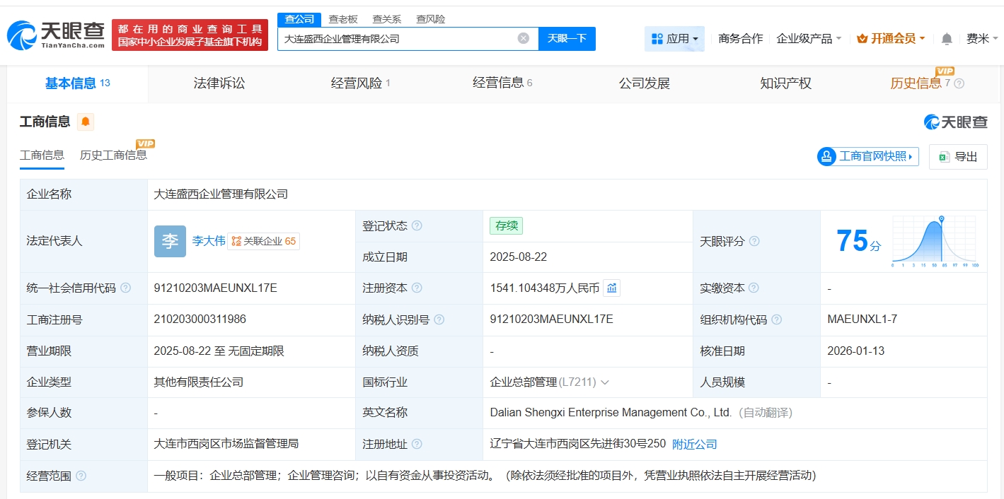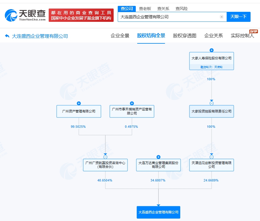 每经AI快讯,天眼查工商信息显示,近日,大连盛西企业管理有限公司发生工商变更,新增大家人寿保险旗下天津远见创新投资管理有限公司、广州国资旗下广州广资航赢投资咨询中心(有限合伙)为股东,同时,多位主要人员发生变更。大连盛西企业管理有限公司成立于去年8月,注册资本约1541万元人民币,法定代表人为李大伟,经营范围为企业总部管理、企业管理咨询、以自有资金从事投资活动。股权全景穿透图显示,该公司现由大连万达商业管理集团股份有限公司及上述新增股东共同持股。