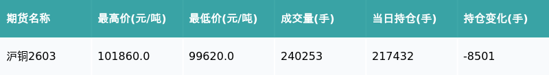 南财智讯1月19日电,南财金融终端盘后期货数据显示,上海期货交易所的沪铜主力合约收跌0.68%,收盘报101180.0元/吨,日内资金流出6.91亿元。其他相关指标见下表: