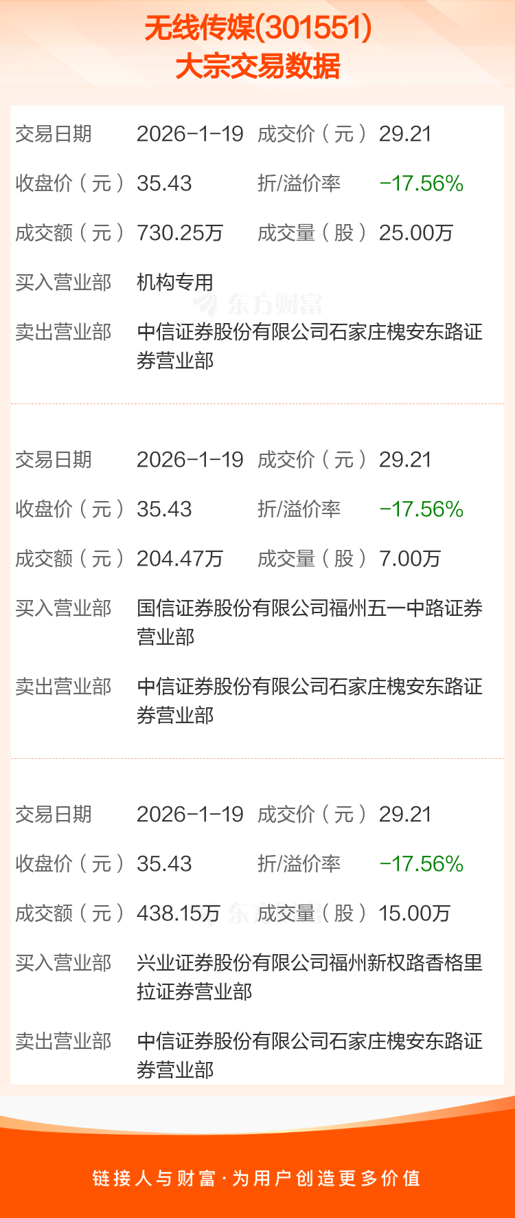 2026年1月19日,无线传媒发生3笔大宗交易,共成交47.00万股,成交金额1372.87万元,占其流通市值比例为0.25%。