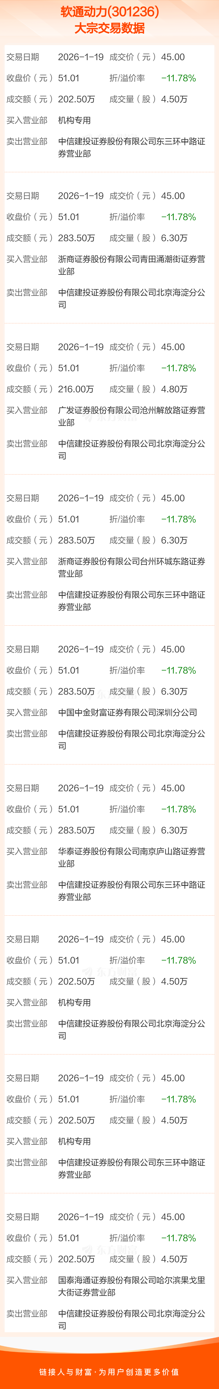 2026年1月19日,软通动力发生9笔大宗交易,共成交48.00万股,成交金额2160.00万元,占其流通市值比例为0.05%。