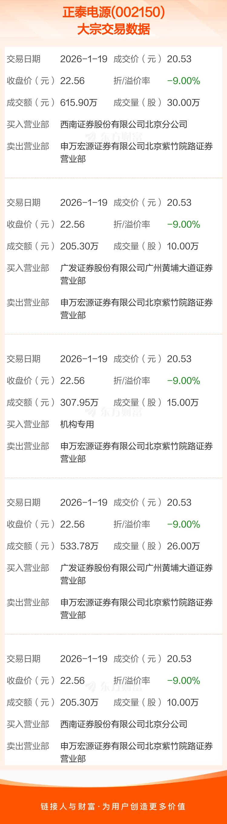 2026年1月19日,正泰电源发生5笔大宗交易,共成交91.00万股,成交金额1868.23万元,占其流通市值比例为0.23%。
