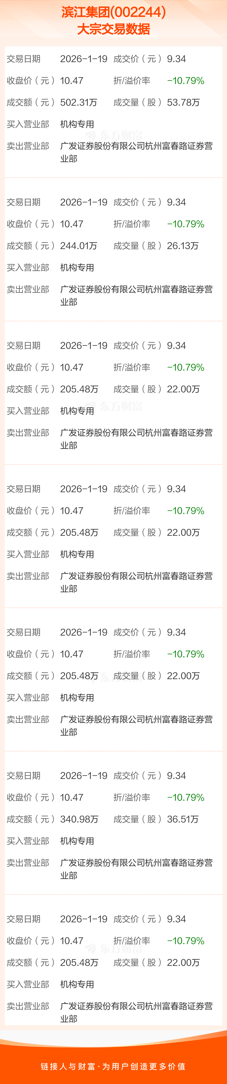 2026年1月19日,滨江集团发生7笔大宗交易,共成交204.42万股,成交金额1909.22万元,占其流通市值比例为0.07%。