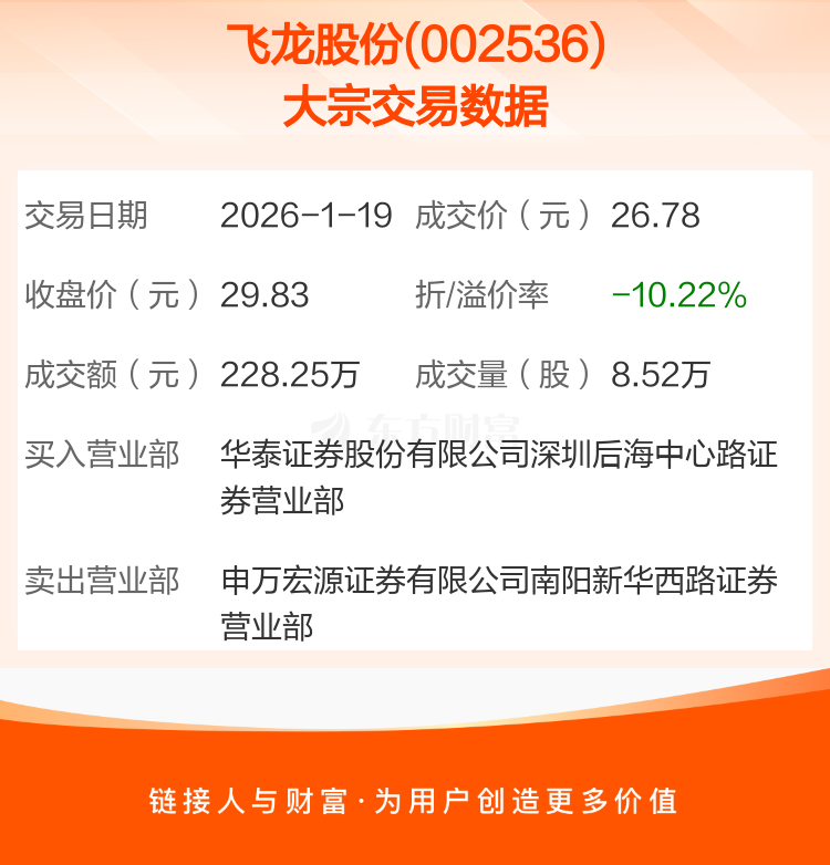 大宗交易:飞龙股份成交228.25万元,折价10.22%(1-19)