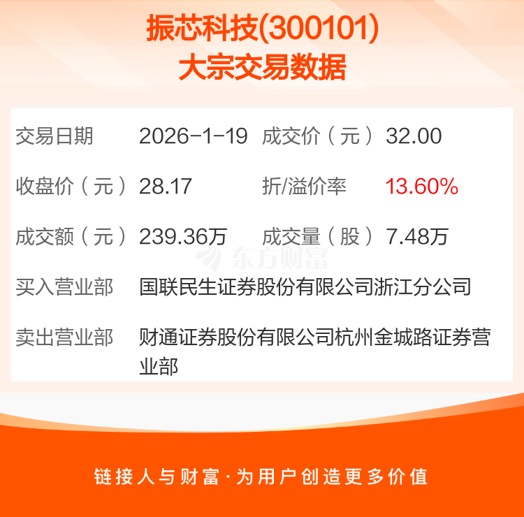 大宗交易:振芯科技成交239.36万元,溢价13.60%(1-19)