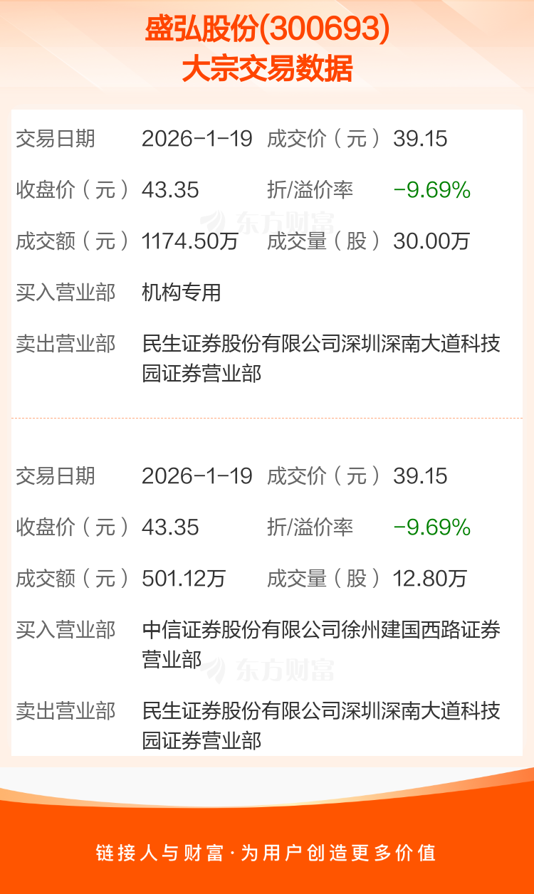 2026年1月19日,盛弘股份发生2笔大宗交易,共成交42.80万股,成交金额1675.62万元,占其流通市值比例为0.14%。