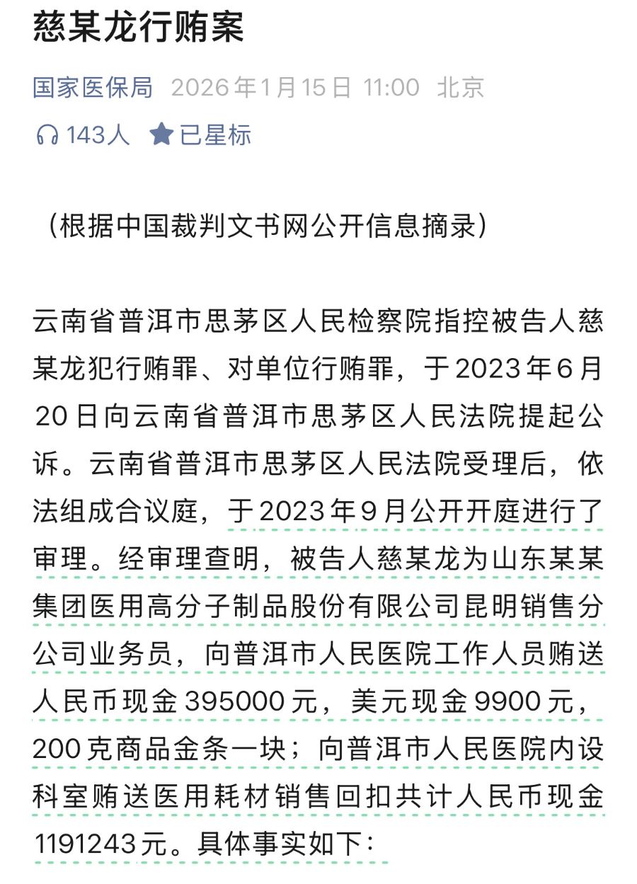 日前,国家医保局官微通报“慈某龙行贿案”,正式揭开这起横跨十余年、牵涉医院超15个科室,覆盖财务部主任、临床科室主任、护士长及普通护士等多层级人员的医疗腐败案件细节。