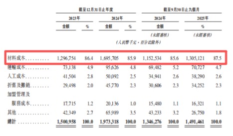 其核心症结或与成本结构的刚性约束密不可分,2023年至2025年9月,材料成本占总销售成本的比例始终维持在85%以上,最高达87.5%。