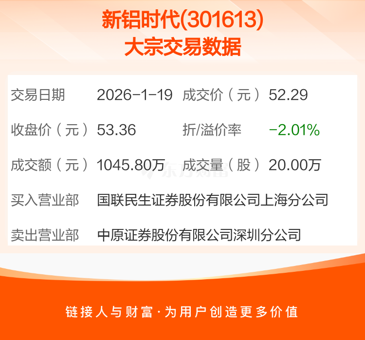 大宗交易:新铝时代成交1045.80万元,折价2.01%(1-19)