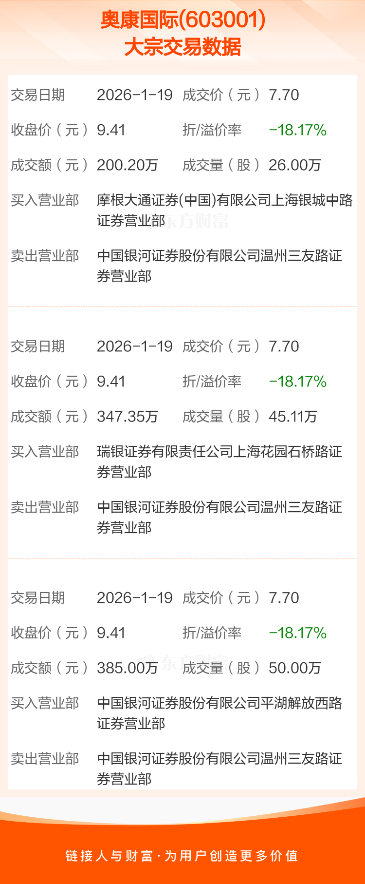 2026年1月19日,奥康国际发生3笔大宗交易,共成交121.11万股,成交金额932.55万元,占其流通市值比例为0.25%。