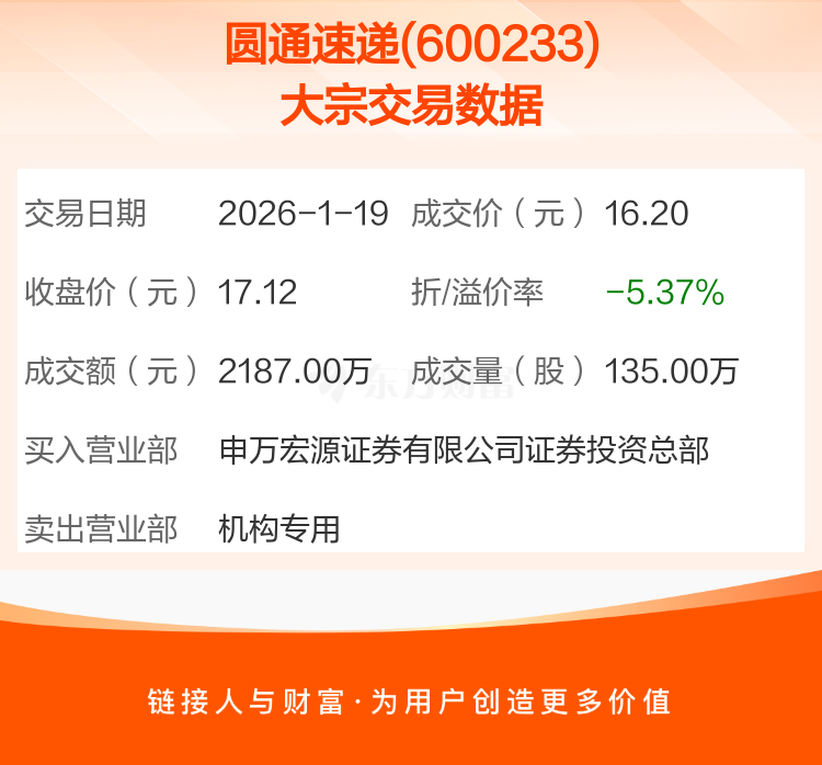 2026年1月19日,圆通速递发生1笔大宗交易,共成交135.00万股,成交金额2187.00万元,占其流通市值比例为0.04%。