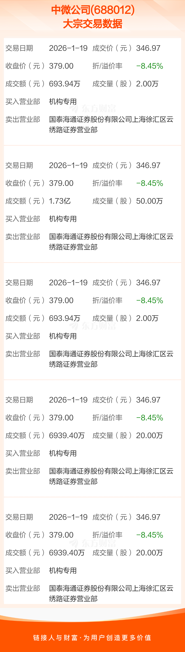 2026年1月19日,中微公司发生5笔大宗交易,共成交94.00万股,成交金额3.26亿元,占其流通市值比例为0.14%。