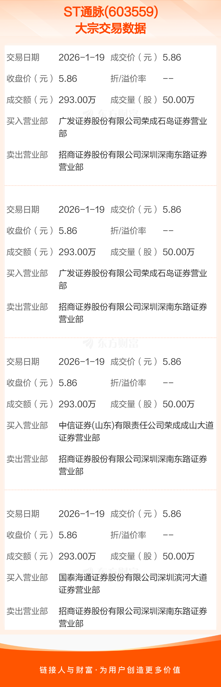 2026年1月19日,ST通脉发生4笔大宗交易,共成交200.00万股,成交金额1172.00万元,占其流通市值比例为0.50%。