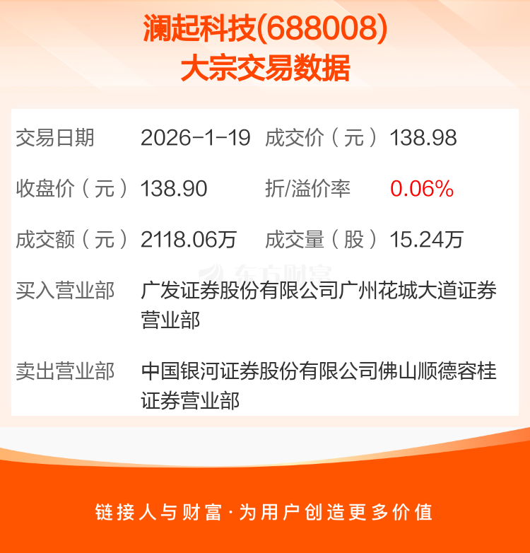 2026年1月19日,澜起科技发生1笔大宗交易,共成交15.24万股,成交金额2118.06万元,占其流通市值比例为0.01%。