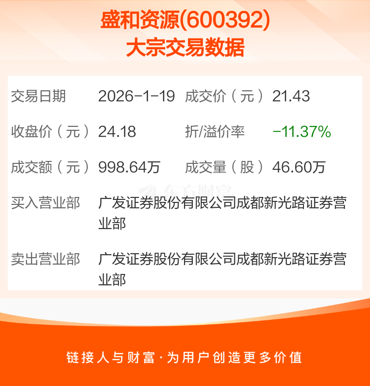 2026年1月19日,盛和资源发生1笔大宗交易,共成交46.60万股,成交金额998.64万元,占其流通市值比例为0.02%。