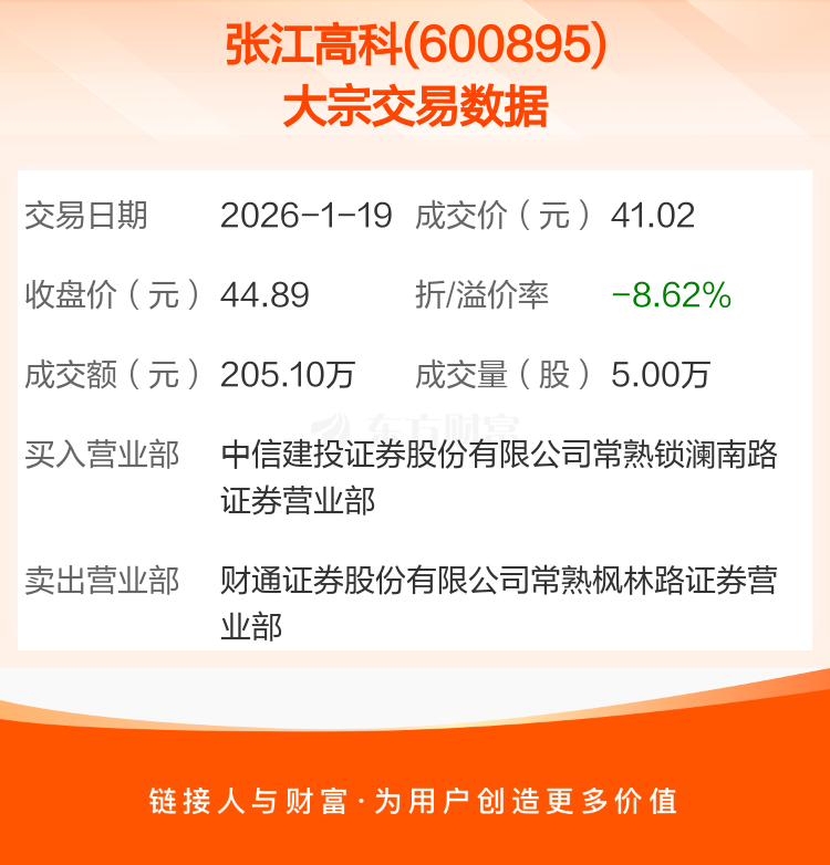 大宗交易:张江高科成交205.10万元,折价8.62%(1-19)