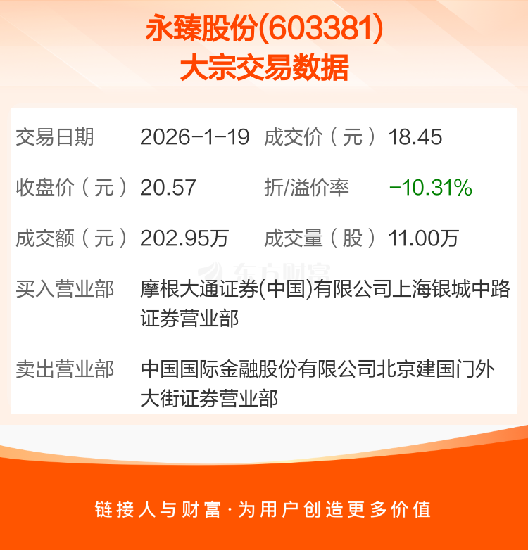2026年1月19日,永臻股份发生1笔大宗交易,共成交11.00万股,成交金额202.95万元,占其流通市值比例为0.07%。