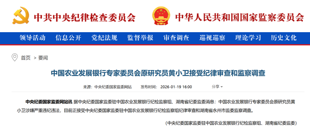 1月19日,中央纪委国家监委官网通报:中国农业发展银行专家委员会原研究员黄小卫涉嫌严重违纪违法,目前正接受中央纪委国家监委驻中国农业发展银行纪检监察组纪律审查和湖南省永州市监委监察调查。
