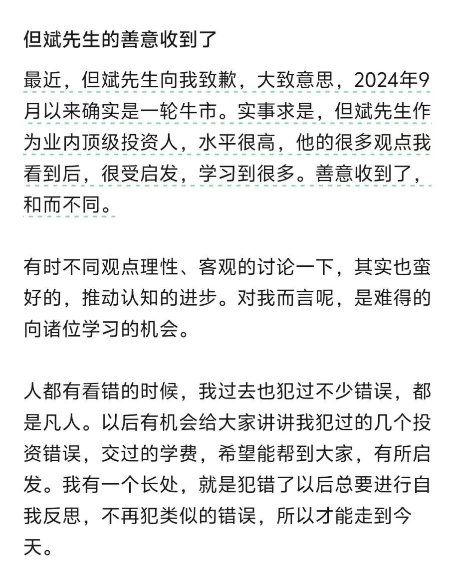 任泽平在文中表示:“最近,但斌先生向我致歉,大致意思是2024年9月以来确实是一轮牛市。实事求是,但斌先生作为业内顶级投资人,水平很高,他的很多观点我看到后,很受启发,学习到很多。善意收到了,和而不同。”