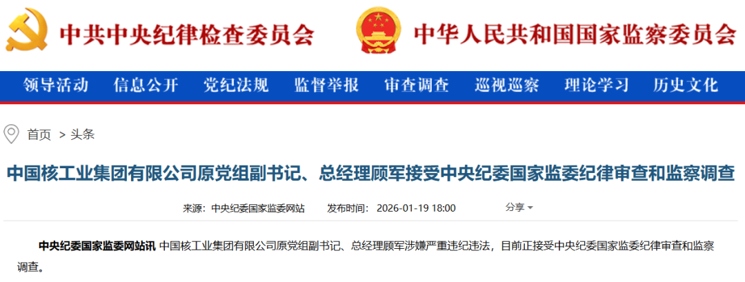据中央纪委国家监委网站消息,中国核工业集团有限公司原党组副书记、总经理顾军涉嫌严重违纪违法,目前正接受中央纪委国家监委纪律审查和监察调查。