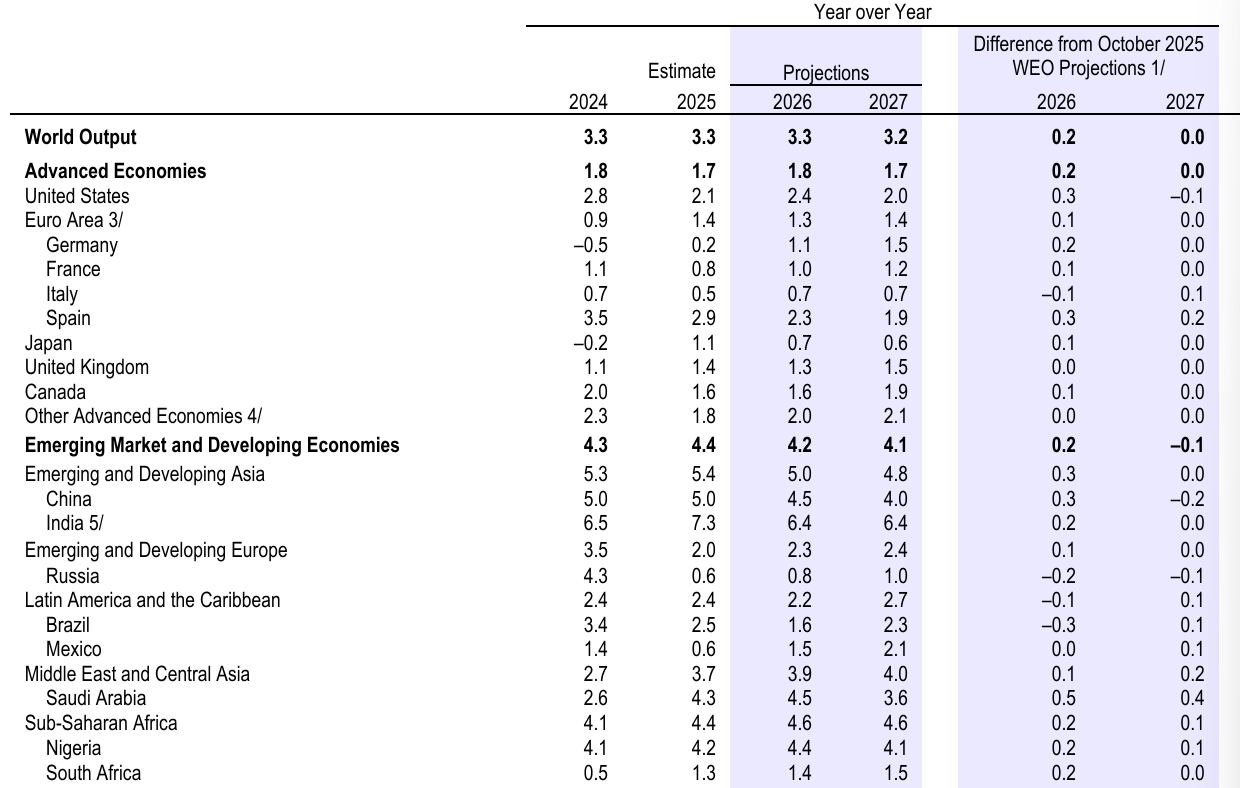 新兴市场和发展中经济体今明两年的增速预期分别为4.2%和4.1%。印度今明两年的增速均为6.4%,从2025年7.3%大幅回落。中东和中亚地区今明两年的增速分别为3.9%和4.0%,撒哈拉以南非洲地区则均为4.6%,都在2025年的基础上有所提速。拉美地区今年的增速略微放缓至2.2%,明年有望反弹至2.7%。新兴欧洲经济体则连续复苏,今明两年增速分别为2.3%和2.4%。