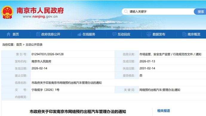 日前,南京市人民政府官网发布通知,公开发布《南京市网络预约出租汽车管理办法》。