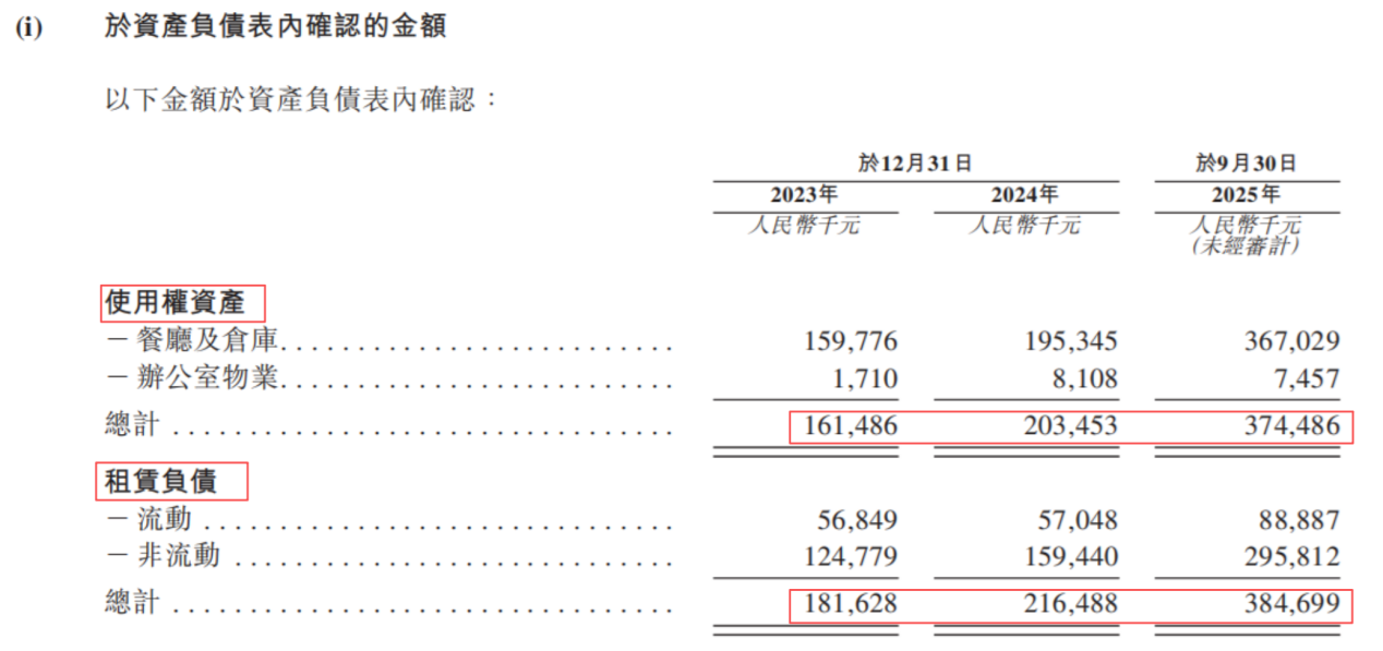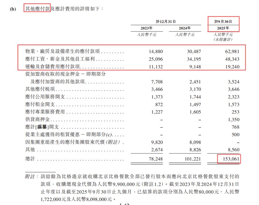 此外,其他应付款项也揭示了运营层面的杠杆运用。2023年至2025年9月末,其他应付款从7800万元涨至1.53亿元,涨幅近100%。其中,同期“物业、厂房及设备产生的应付款项”从约1490万元猛增至近6300万元,意味着新店的资本开支部分由供应商垫付。