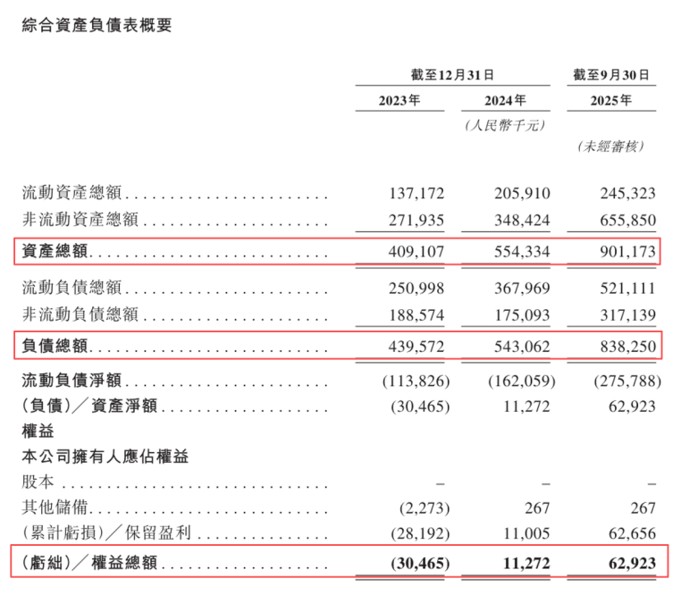 与资产扩张“并驾齐驱”的,是同步飙升的负债。2022年至2025年9月,公司负债总额从4.40亿元增至8.38亿元。这使其资产负债率虽从2023年危险的107.4%下降至2025年9月的93.02%,但仍处于高位。
